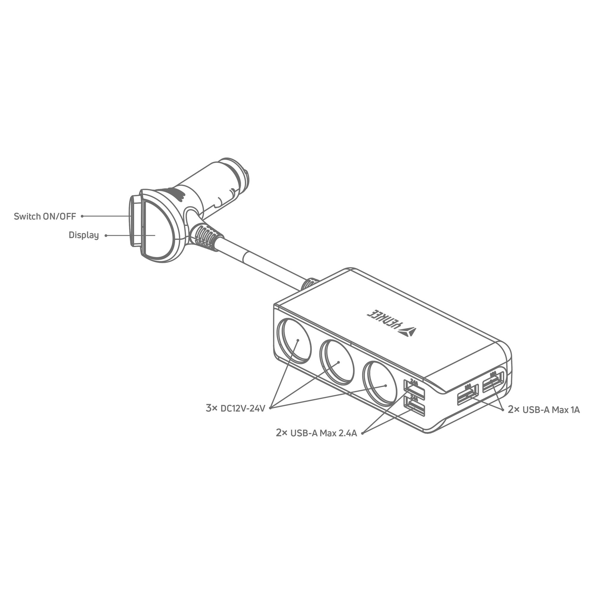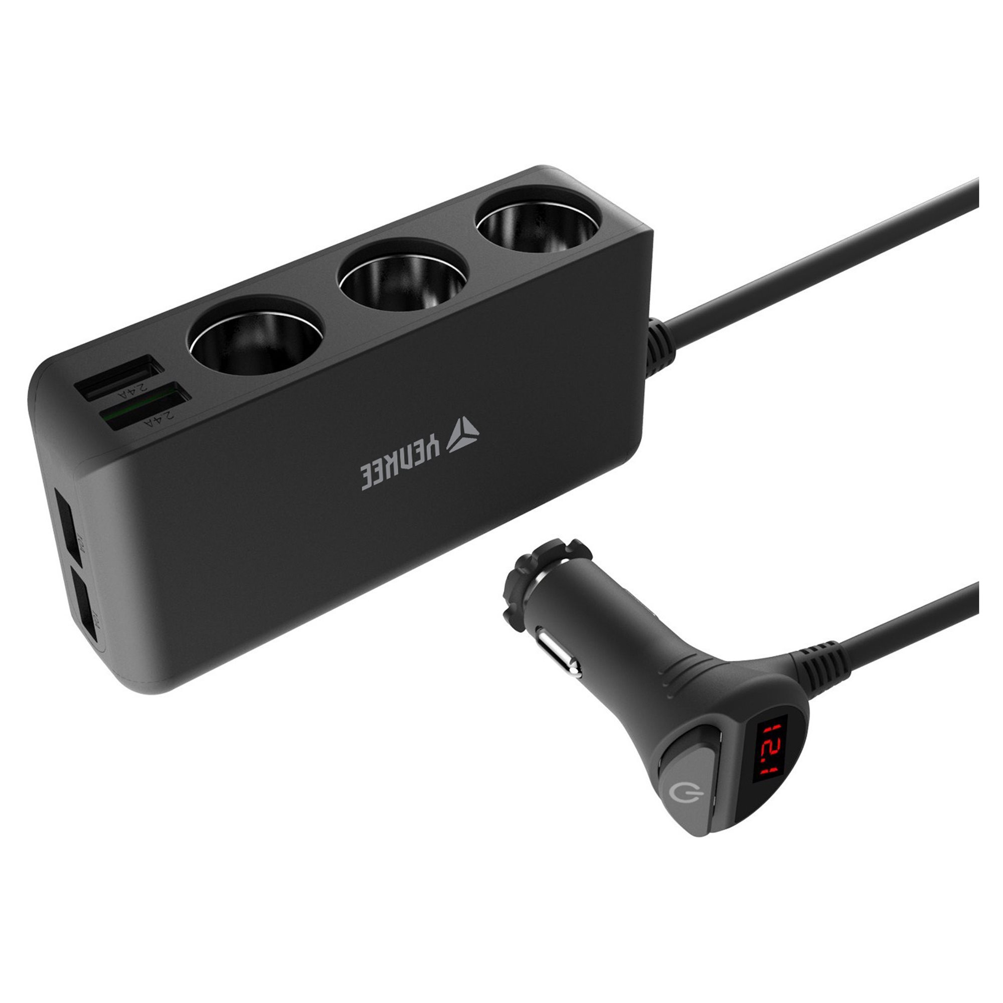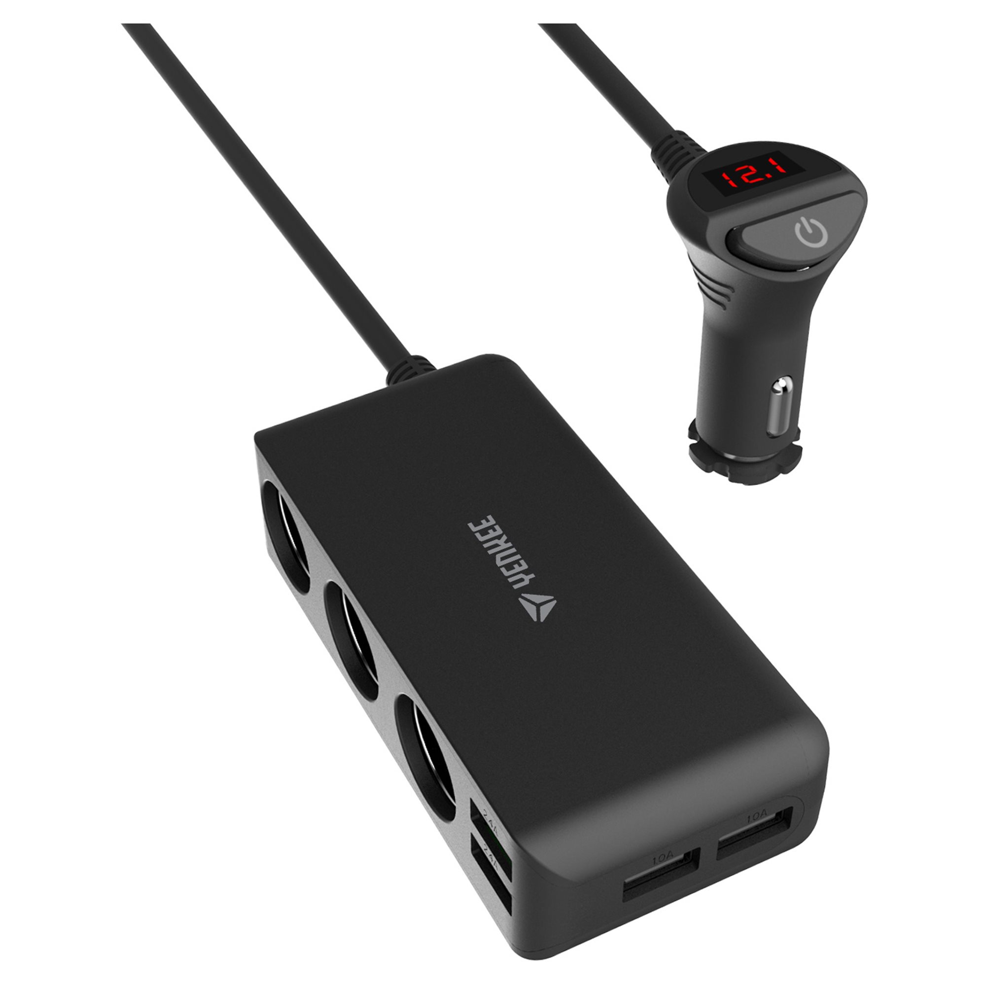 Powerful charging station can charge up to seven devices simultaneously. It has four USB-A ports and three 12 V outputs.