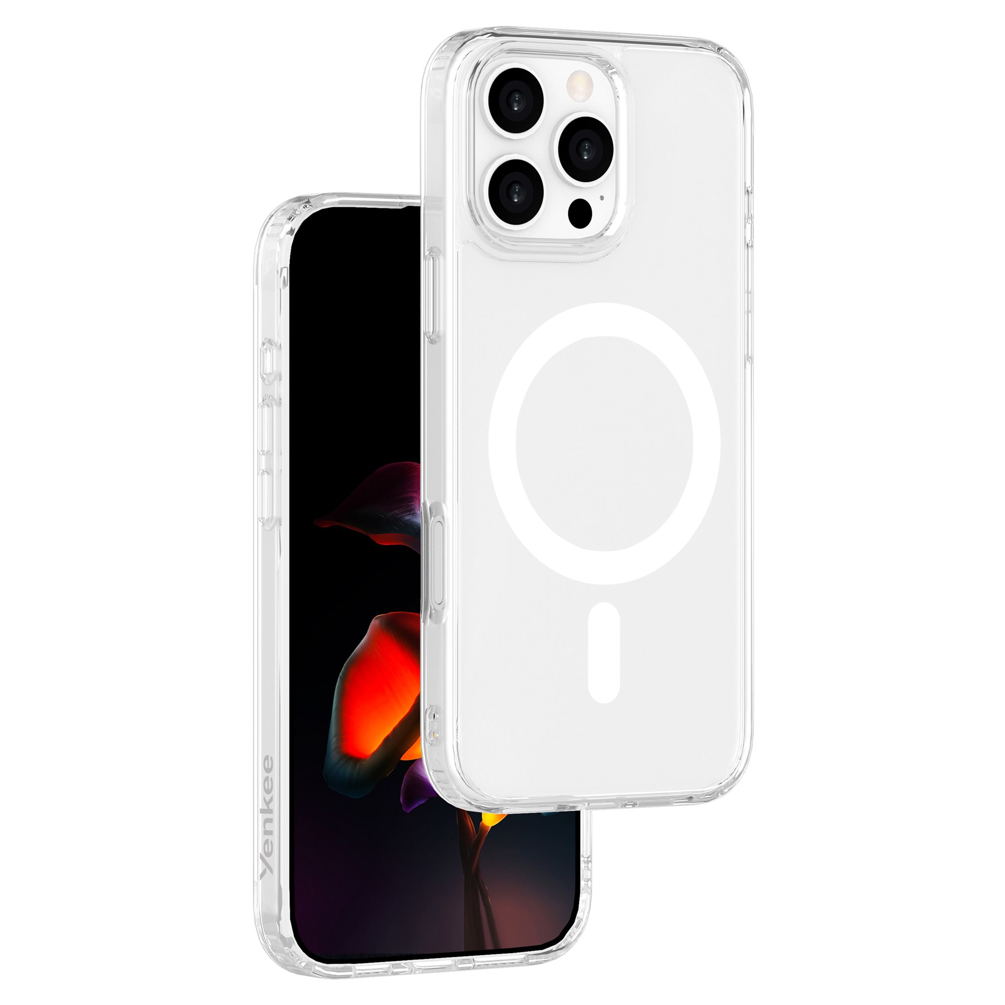A thin transparent mobile phone case compatible with MagSafe ensures comprehensive protection for your phone. Enhanced protection is provided by a slight overlap above the phone's display, protecting it from potential damage.