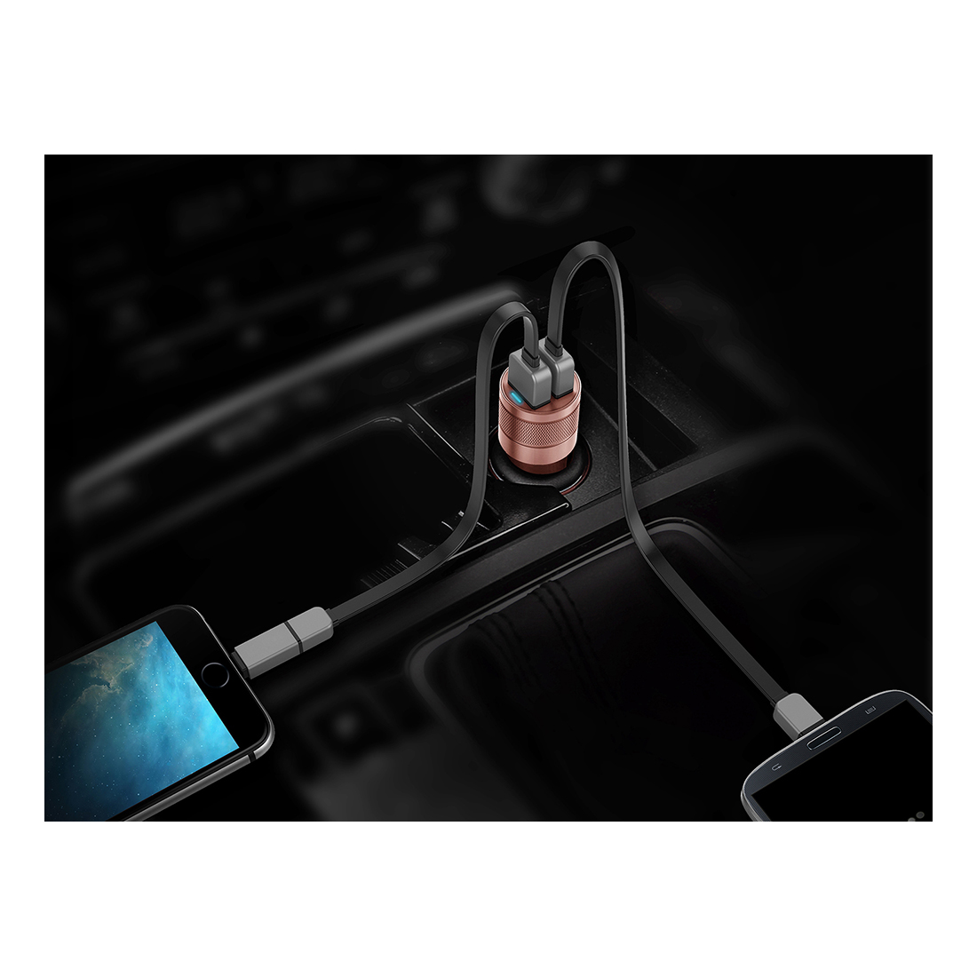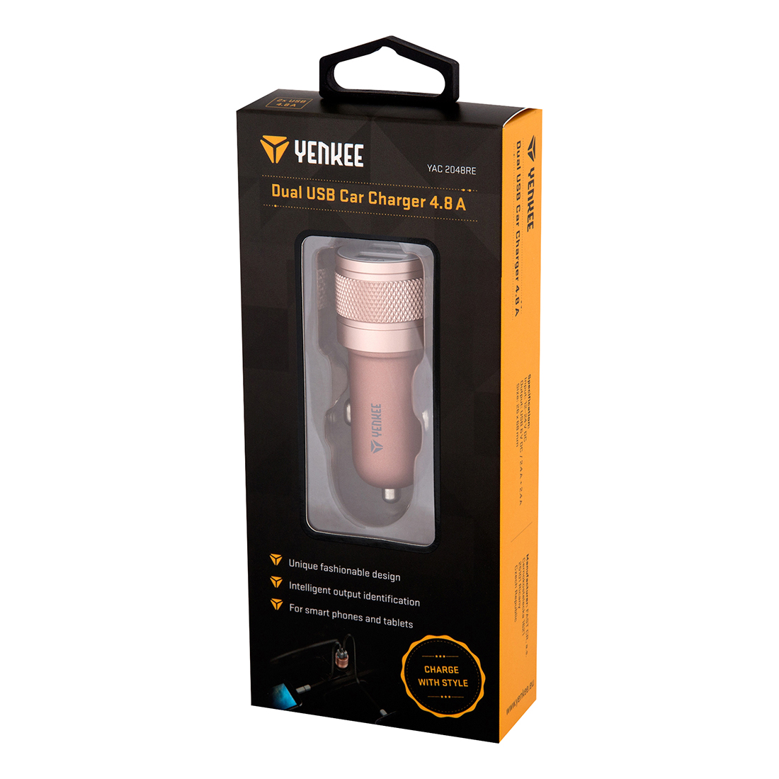 Fashionable dual 4.8A car charger with intelligent output identification on each USB port. Charger is suitable for smartphones and tablets and it can charge two devices simultaneously.