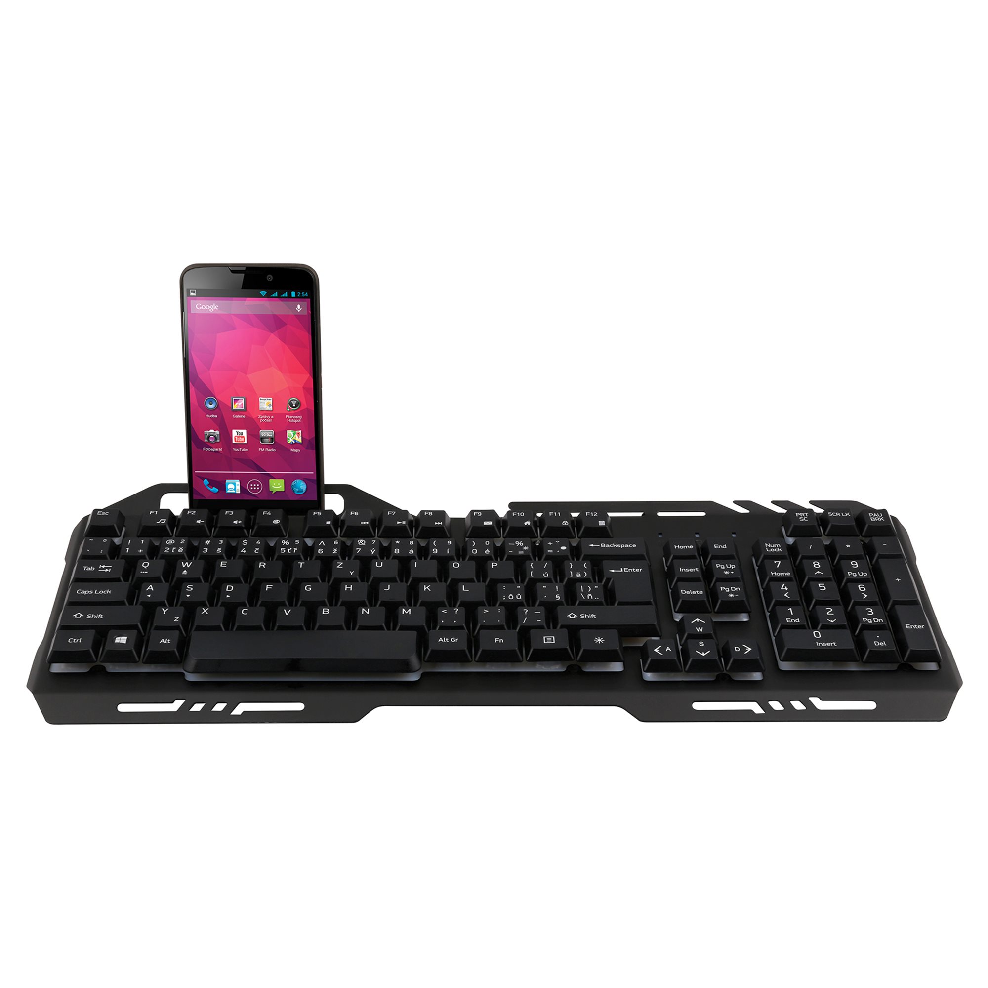 Metal keyboard with smartphone holder