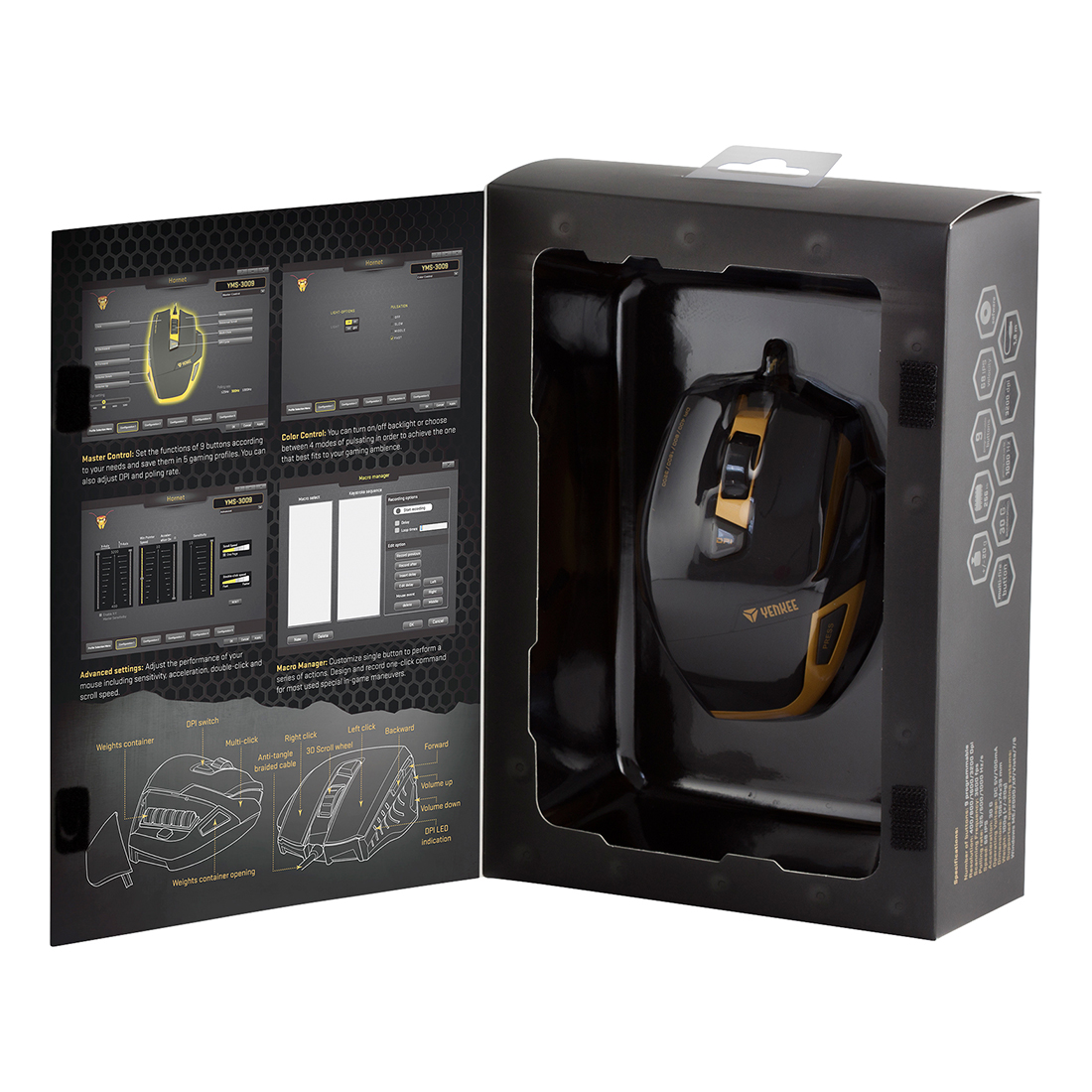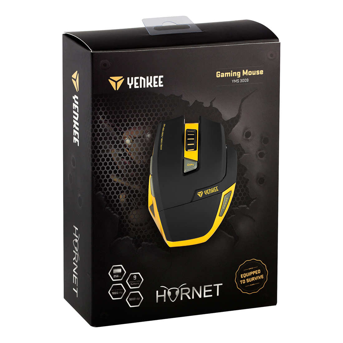 The HORNET YMS 3009 Optical Gaming Mouse is designed for advanced computer game players seeking not only quality but also design. The optimal "survival" arsenal and its full utilisation during missions is looked after by a total of 9 programmable buttons, incl. the ergonomic "multi-fire" button on the right side of the mouse.