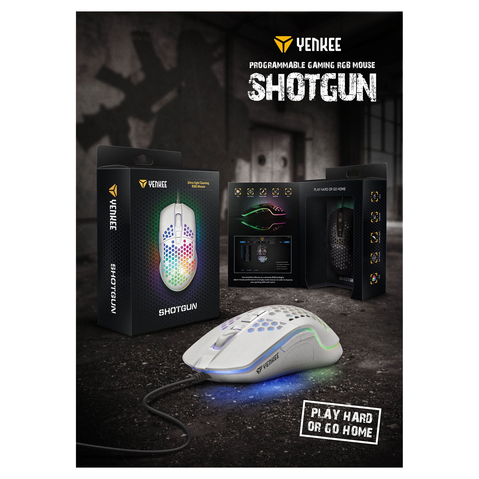 Shotgun. Ultralight Shotgun gaming mouse. I am your most favourite gaming mouse for the future. My body is interwoven with holes that not only lighten the entire structure, but mainly add to the airiness. This will prevent your hand from sweating during long game marathons, making the path to the victory even easier!
