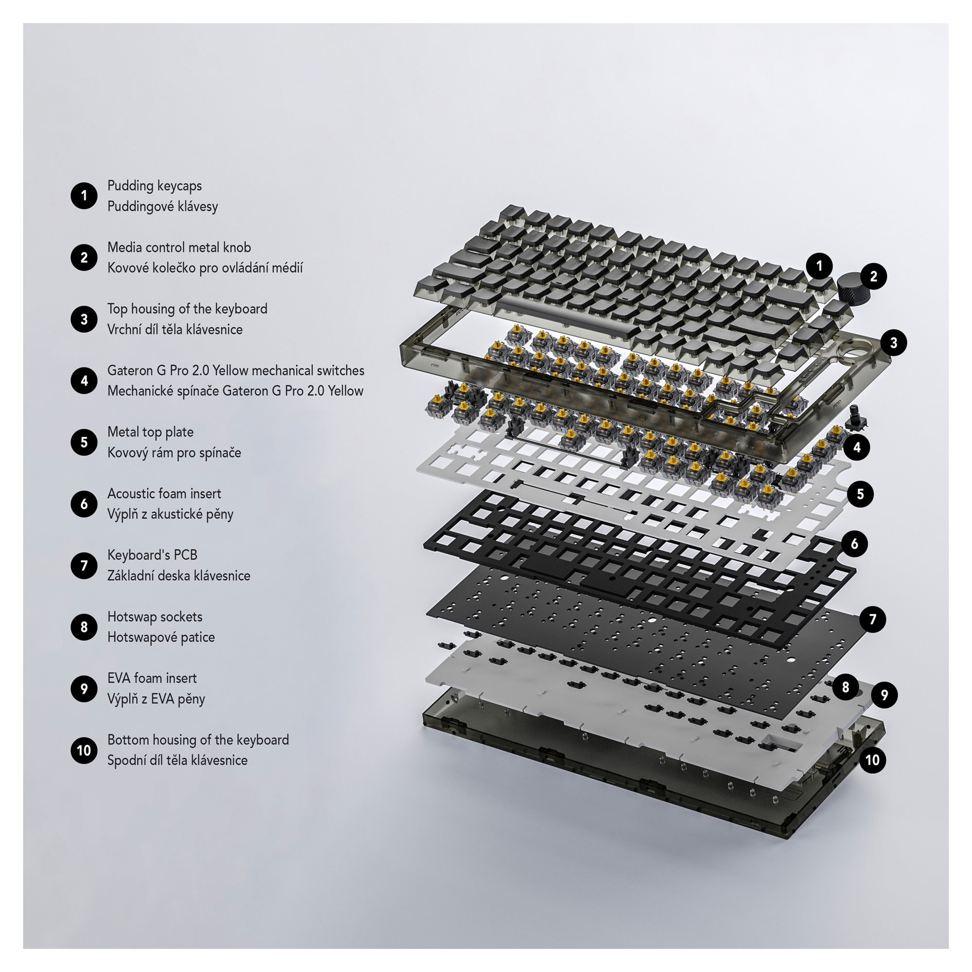 Experience the pinnacle of keyboard engineering with ODYSSEY, the high-end hotswap 75% layout mechanical keyboard that redefines typing comfort and customization. Every aspect of the ODYSSEY is crafted with meticulous attention to detail, delivering a seamless fusion of style, performance, and innovation. Equipped with Gateron G Pro 2.0 Yellow mechanical switches, renowned for their buttery-smooth keystrokes and reliability, ODYSSEY ensures each keypress is a delight. What sets ODYSSEY apart is its revolutionary hotswap sockets, allowing you to effortlessly swap switches without any soldering. This means you can tailor your typing experience on-the-fly, whether you prefer the swift actuation of linear switches for gaming or the precise feedback of tactile switches for prolonged typing sessions.