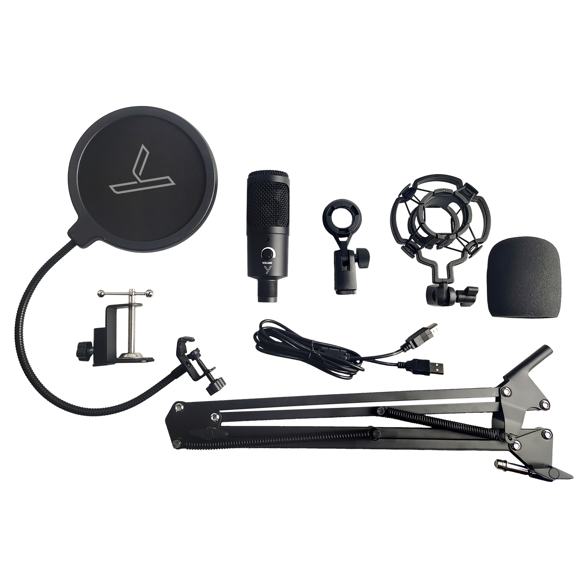 The set includes a pop filter, antivibration holder, windscreen, adjustable studio stand, and USB-B to USB-A cable.