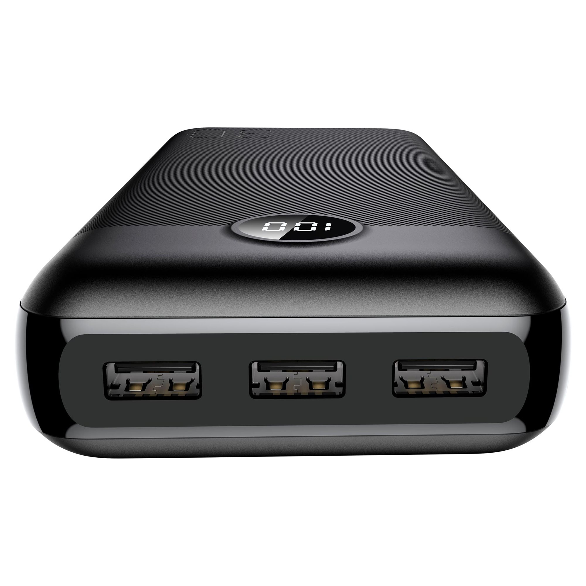On my elegant body you will find a total of 4 USB connectors, namely 3× USB-A and 1× USB-C, as well as 1× micro USB input for charging the power bank. So you don't have to worry about which end your cable has, just reach for the first one you have on hand and simply recharge. Smart LED display will let you know how full I am, showing you the current capacity of my battery. If the light disturbs you, you can simply switch it off or on again using the side button.