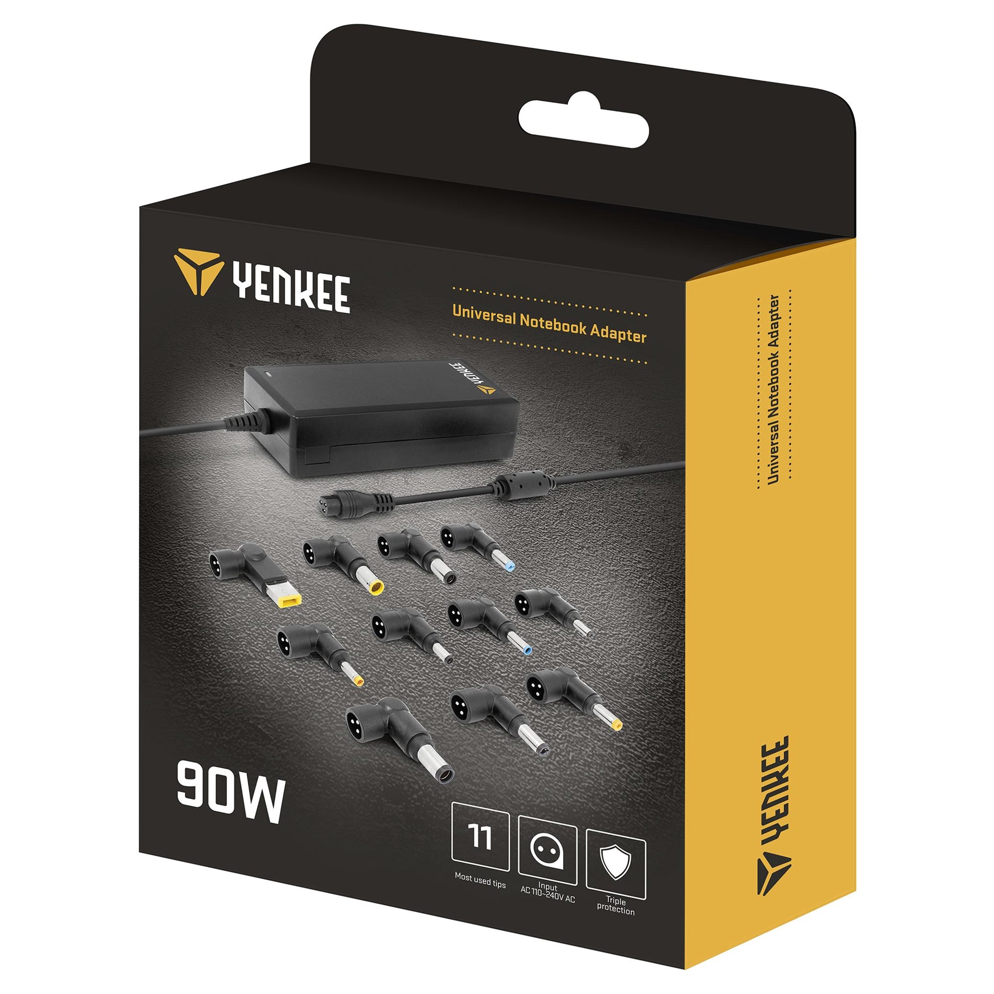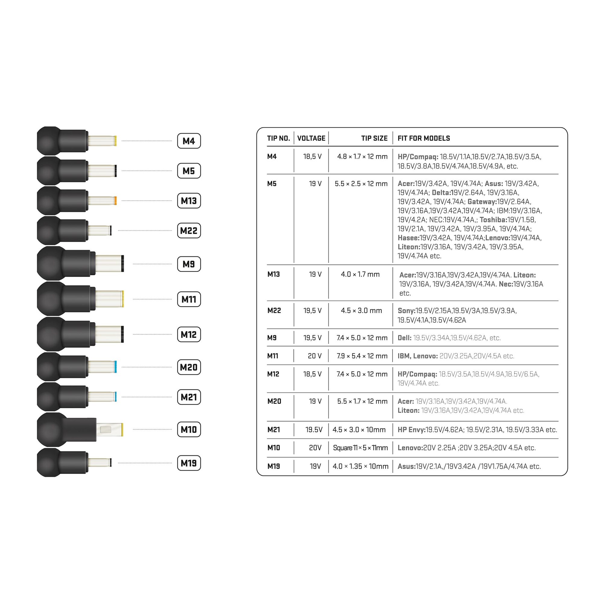 Universal notebook adapter suitable for most commercially available models thanks to the set of 11 detachable connectors.