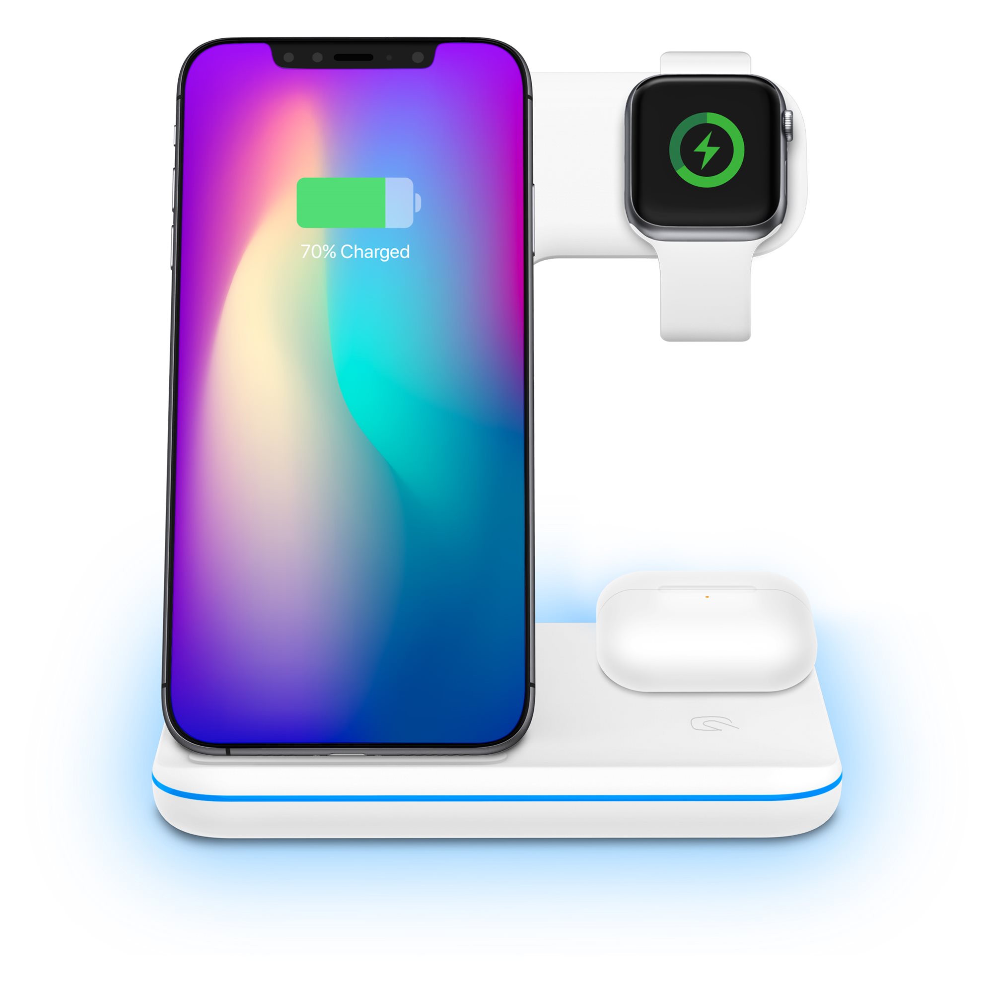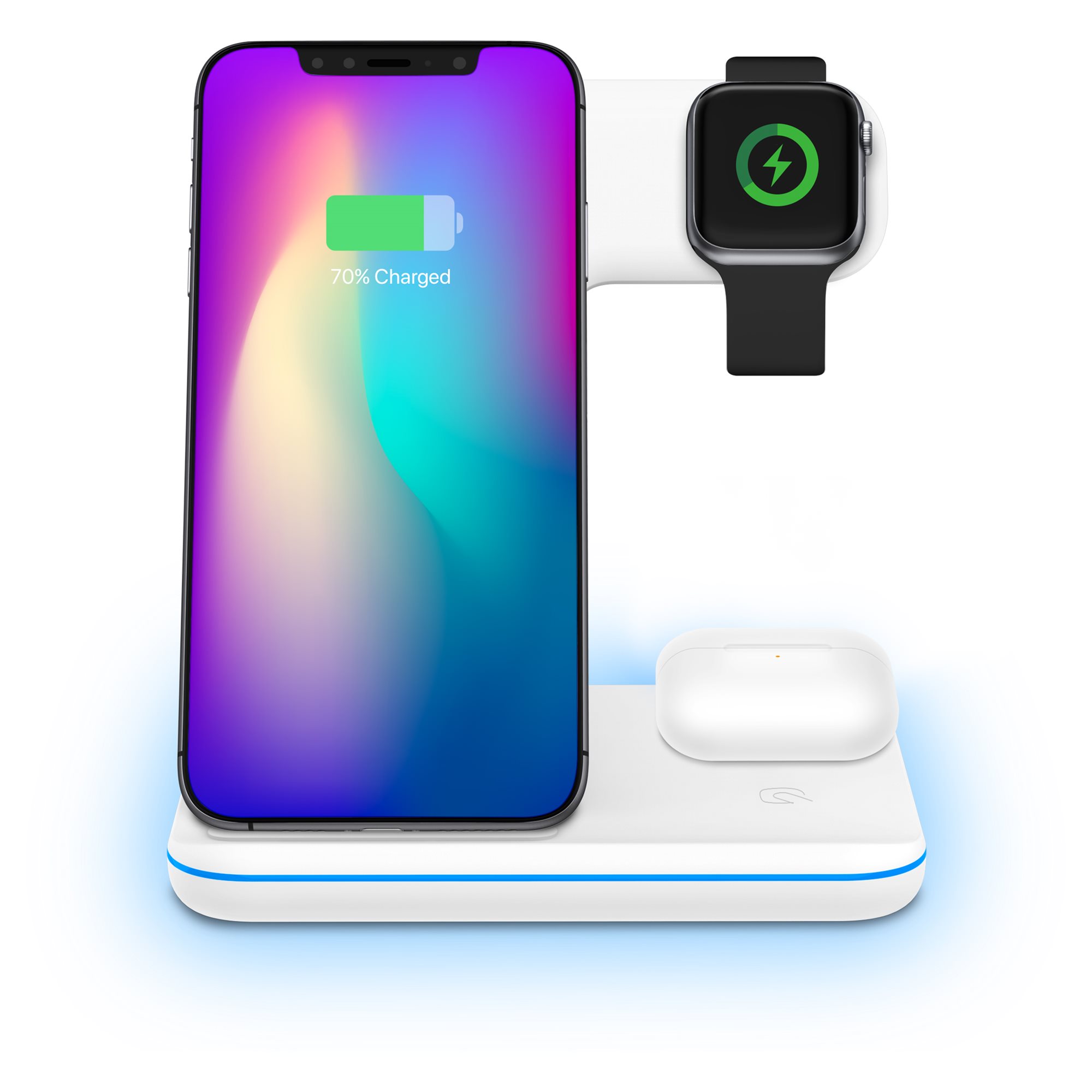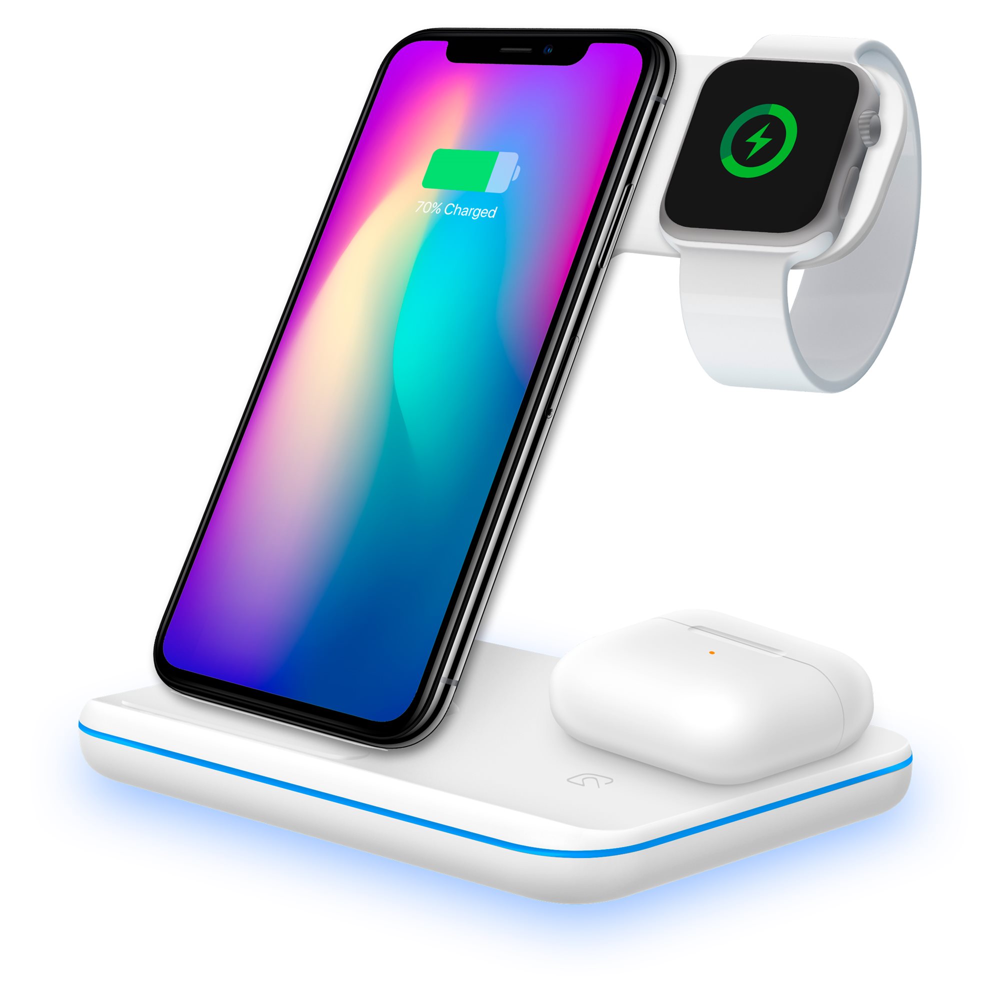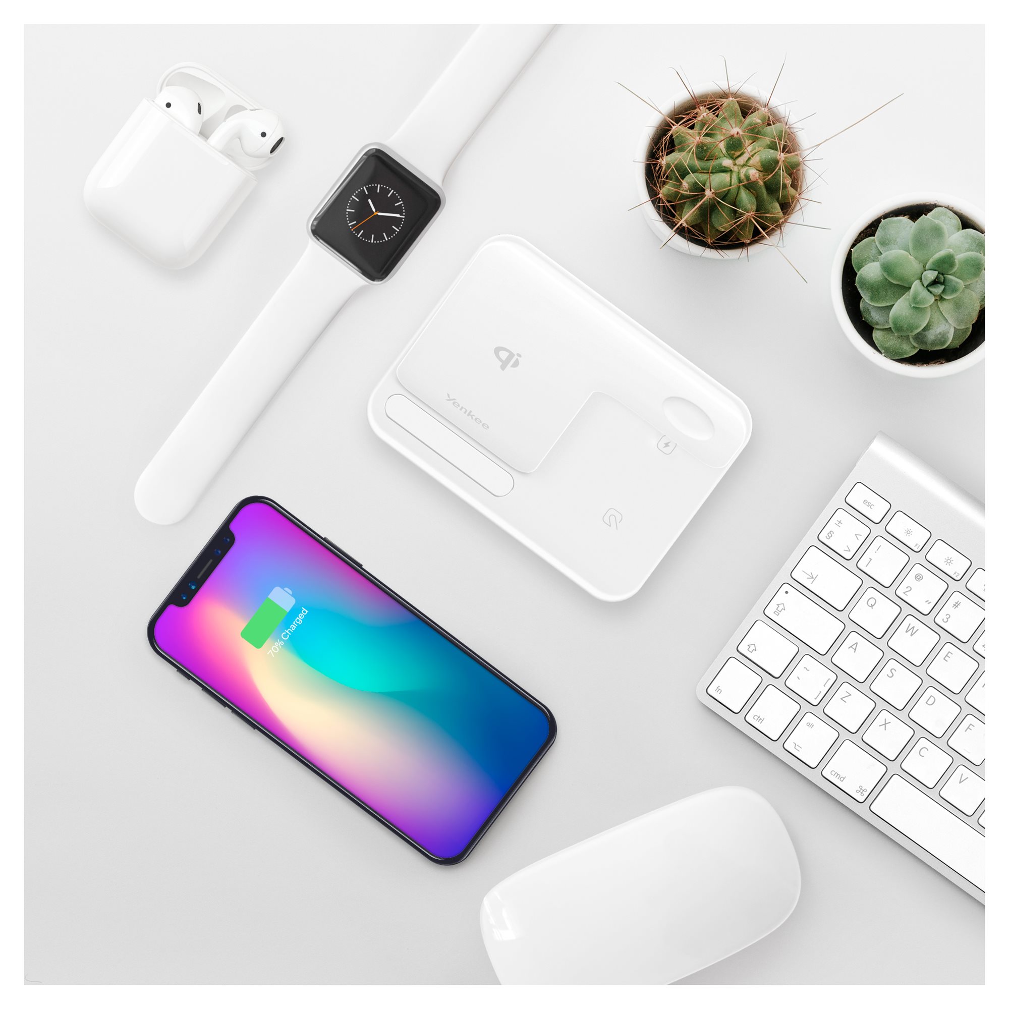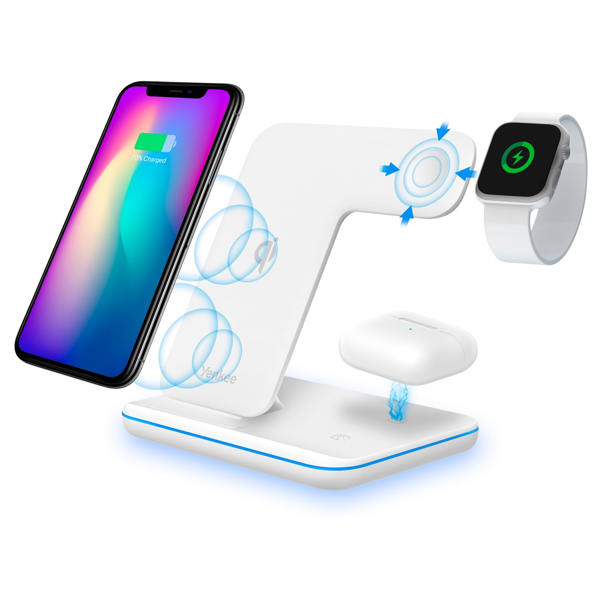 The YENKEE YAC 5301 3-in-1 wireless charger is compatible with phones equipped with Qi standard at the factory. If your phone does not have this standard, the LED will flash and charging will automatically stop. The charger also has safety features such as overheat protection, input overvoltage protection and output overcurrent protection. The charging status is indicated by an LED signalling light around the perimeter of the charger. The LED can be turned off with a touch button. Enjoy the revolution in charging and let yourself ride the wave of trend and compatibility.